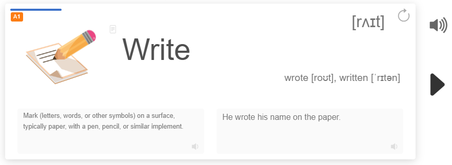 - على الوجه الأمامي: الكلمة في لغة الهدف مع الصوت، مستوى الكلمة، النطق المكتوب (transcription)، صورة، وحقلي Description و Example مع الصوت.