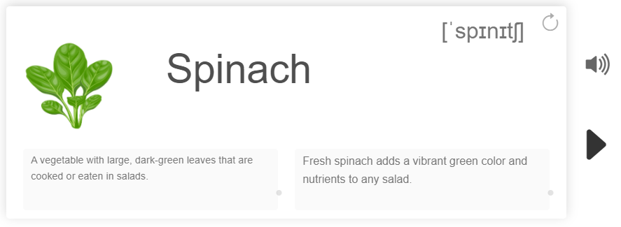- Kartı çevir ve kelimenin çevirisini ve örnek cümlenin çevirisini gör (örneğin kendisi hedef dilde kalır)